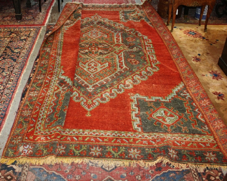 Floral, medallion, closed field, cream border, burnt orange background, signed, silk on silk.
