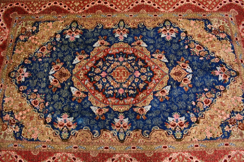 Floral, medallion, closed field, pink border, blue background, signed, silk on silk.